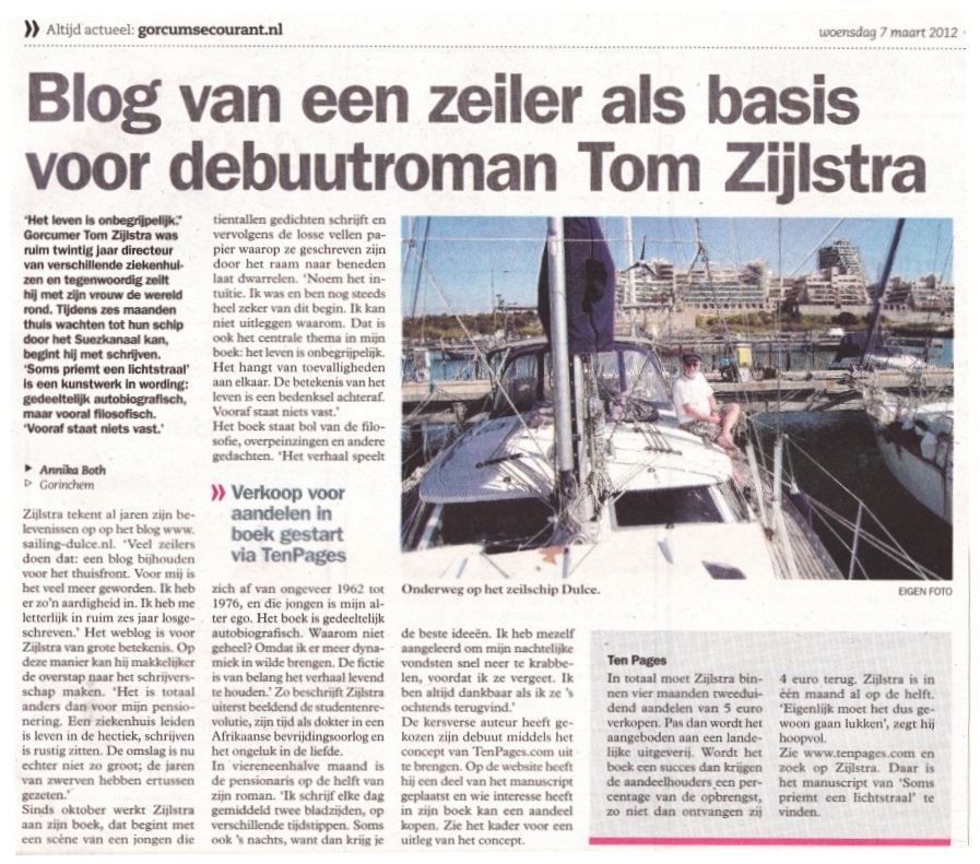 Vanmorgen maken we een lange wandeling over Sheraton Road, om voor de hand liggende redenen in de wandeling ook wel Sherry Road genoemd. In de Metro-supermarkt laden we ons karretje vol met voorraden, voor het geval we in de komende dagen kunnen vertrekken. Daarna aan het werk. Ik kijk ieder uur op TenPages of we al op de 2000 aandelen zitten. Het schrijven gaat lekker en daardoor vergeet ik te kijken. Opeens piept om 16.45 uur Egyptische tijd de telefoon: een SMS van schoonzoon Michel. "Gefeliciteerd met het halen van de 2000 aandelen", luidt het bericht. Krijg nou wat! Snel kijken we op de boekpagina en ja hoor, "Soms priemt een lichtstraal" heeft de eindstreep gehaald - en zal worden uitgegeven! De laatste zet kwam van een dame met het pseudoniem 'Gewichtsconsulente'. Ik weet hoe ze eigenlijk heet, maar dat houd ik voor me, want ze koos niet voor niets voor een pseudoniem, neem ik aan. Natuurlijk stuur ik haar een bedankje. Wie kochten de laatste aandelen? In volgorde: Lassie (stamgast in Wijnhuis Heukelum), Nimbus2000 (zeiler, websitelezer), Hartvelt (idem), Seawind (idem), Gert Reedijk (bevriend zeiler), Hwar (?), Schliekelmann hfm (investeerder die bijkocht), Willem Rothuizen (stamgast in Heukelum, kocht bij), Paanakker (?), Maarssen (?), Gerben Broens (?), Janthai (kocht bij), Wessel Sikma (investeerder), Eres (?), MDA (?) en eerder genoemde Gewichtsconsulente. Allen hartelijk dank! Ik begrijp dat de crew van TenPages alle aandeelhouders per email op de hoogte heeft gesteld. Er komen veel felicitaties, per email, per SMS, in het Gastenboek en per telefoon.