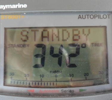 Hieronder zie je twee displays van de autopilot. Op de eerste (Standby) staan de streepjes van de roerstandsensor (onderaan) helemaal links. Op de tweede - Autopilot aan - staat er nog eentje naast het midden, terwijl het stuurwiel fiks naar rechts gedraaid is. Ik verwacht daarom dat ik een gedeeltelijke SEATRIAL-calibratie moet uitvoeren om dit te corrigeren en ook de miswijzing van 25 graden weg te krijgen. Dat komt in juni wel.