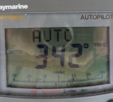 Rustige nacht. Nuchter bloedsuiker 6,0 mmol/l. Met 36o in de middag opnieuw een warme dag. Lichte wind uit het zuiden. We brengen de dag grotendeels in de kajuit bij de ventilator door. Met het Raymarine-systeem wordt het steeds gekker. Fons wees me er per email op dat ik om de roergegevens weer keurig in het midden op het Autopilot-schermpje op de stuurstand te krijgen, niet de hele SEATRIAL-calibratie hoef te doorlopen, maar dat het eenvoudiger via de DEALER-calibratie kan. Mooi, dat is zo gebeurd. Als ik het systeem aanzet en boven op het schermpje ga kijken, staan de roergegevens echter al keurig in het midden! Eergisteren waren er helemaal geen roergegevens, gisteren waren ze er wel maar helemaal naar links verschoven (kijk maar op de foto in het verslag van gisteren) en vandaag staan ze keurig in het midden! Een onverklaarbaar fenomeen van 'autocalibratie'? Dit bestaat toch niet? Dit grenst aan tovenarij! Nietwaar? Alleen denk ik wel eens, dat wat je zo in de schoot geworpen krijgt, je ook zomaar weer kwijt kan raken. Maar goed, vooralsnog is het mooi. Ook de sturrautomaat doet het, alleen de miswijzing van 25o is er nog. Je begrijpt dat ik verwacht dat die morgen ook vanzelf opgelost is.