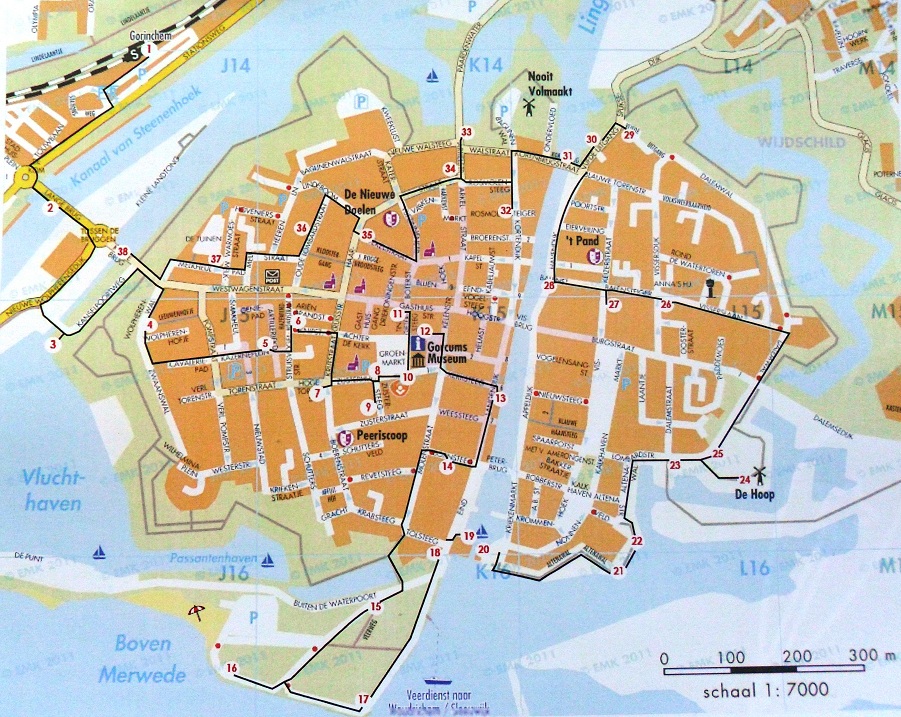 Een aantal dagen geleden ontving ik een volledige beschrijving van de aanstaande Poëzieroute in Gorcum, van een van de initiatoren Rijk van Kooy. Hieronder een plattegrond van de route met alle - tot dusver - goedgekeurde 38 lokaties. Die op ons huis is nummer 19, middenonder, bij de sluis en het zeilbootje dat de jachthaven aangeeft. De route begint op het station, voert dus langs 38 lokaties met een gedicht en eindigt bij Restaurant Metropole aan het Melkpad. Vandaar is het niet ver lopen naar het station terug. In de bundel die ik van Rijk kreeg, staan ook foto-impressies van alle lokaties, met hun gedichten. Die van ons zal ik morgen laten zien.