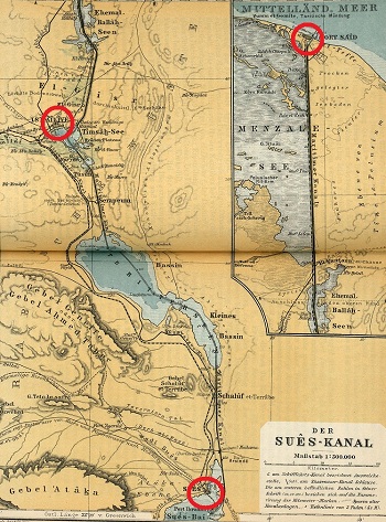 Duitse kaart uit 1914 van het Suezkanaal. De rode cirkels van zuid
