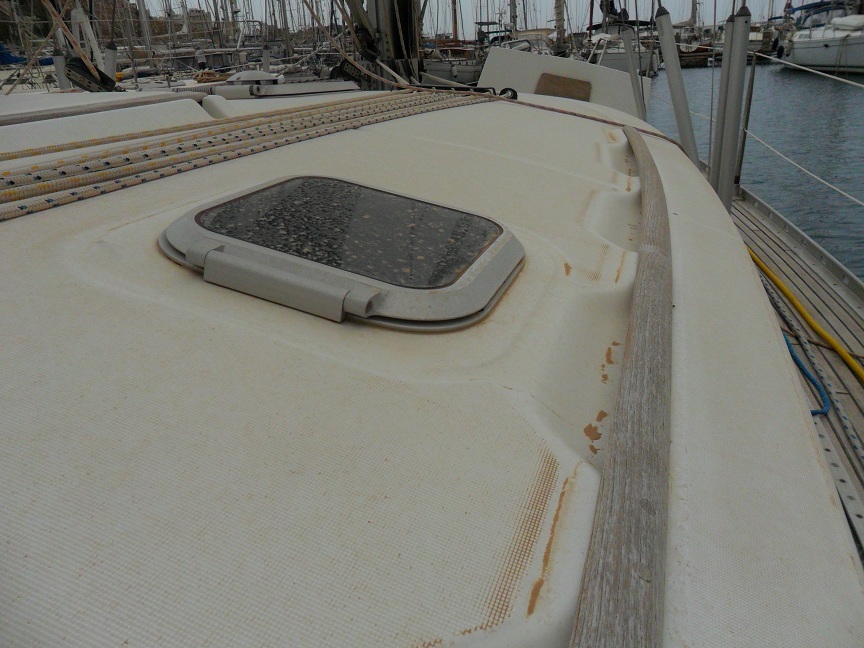 Om vijf uur tikken er verdwaalde druppels op het dek, regen vermengd met roodbruin zand. De wind is wat afgenomen, we vallen weer in slaap. Om negen uur staan we op, het is zwaar bewolkt en kil maar de wind is vrijwel weg (foto hierboven). Het dek ligt vol met roodbruin zand (zie hieronder), wat zonde van al ons schrobben en poetsen. Het heeft geen zin om het nu schoon te spuiten, voor vandaag voorspelt Radio Iraklion méér regen en opnieuw harde wind, nu uit het westen.