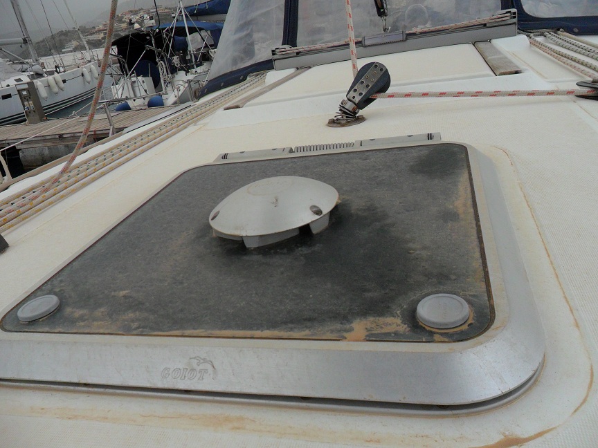 Een uur later rijden we het terrein van de marina op. In de verte ligt onze Dulce, een machtig gezicht! Het onderwaterschip is gevefd,, behalve bij het roer en op de plaats van de laesie rechts achter de boegschroefkoker. De rieten mand is van ellende van de achterstoel gevallen, de ietwat lekke waterslang uit Egypte zit er nog in. De accu's zitten vol, dankzij de zonnepanelen. Zwetend hijsen we de koffers aan boord en vangen de uitpak- en opbergoperatie aan. Wat is het warm! En winderig! We zetten na een uur de ventilator in de achterhut en richten hem op het bed, op onze zweterige lichamen. Een kwartier later staat Kostas voor de deur. Ik loop met hem mee naar de plek met de craquelé sterfiguur in de romp. Met een vochtmeter van Sovereign laat hij me zien wat er aan de hand is: op die plek is er beduidend meer dieptevocht dan er omheen. Circa 17%. Er wordt dus vocht aangezogen door de gelcoat heen. 'Now let's have a look at the inside', zegt hij. Op die plaats zit in de vuurhut het frontpaneel van het bed. We duiken onder de vloer en zie: er zit een kleine, overlangse barst waar het paneel aan de scheepshuid gelamineerd is (foto hier). Omdat het paneel niet van wand tot wand loopt, oefent deze plek extra druk uit op de scheepshuid, zeker als je klappen op het water maakt bij tegenwind en golfslag tegen. Laten we buiten de antifouling wegschuren en zien of die spinnewebfiguur ook in de gelcoat zelf zit, zeg ik tegen Kostas. Dan blijkt dat dat inderdaad het geval is (foto hier). Nu is alles duidelijk: dit is een zwakke plek, waar water in het laminaat lekt. Voor de stevigheid van de scheepsconstructie kan dat vooralsnog en jarenlang geen kwaad, maar het is beter om de plek af te dichten en ook van binnen te verstevigen. Ik kijk somber, wat gaat dat niet kosten? Nou, iets meer dan tweehonderd euro, zegt Kostas. Dat valt mee en hij kan er snel aan beginnen.