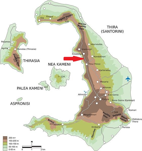In de periode tussen 1627 - 1600 vChr. was er een hevige vulkaanuitbarsting, heviger dan die van de Krakatau in 1883, die het eiland volledig van vorm veranderde. Van het eiland bleven alleen de scherpe kraterwanden over. Die vormen nu een kleine binnenzee, waar de vulkaanrest als een eilandje middenin ligt. Een aardbeving en een enorme tsunami volgden, die de noordkust van Kreta verwoestten. De vulkaan is nog steeds aktief, de laatste eruptie was in 1956. In wezen zijn we opnieuw, net als destijds op de Vesuvius en de Etna, op gevaarlijk gebied. Oh ja, en het eiland Nissiros, dat op dezelfde breuklijn als Santorini ligt. Ik ben zwaar onder de indruk van de gigantische krachten die eens dit eiland vorm gaven. De mens is nietig (en is tóch in staat de planeet te verwoesten met overbevolking en klimaatverandering).