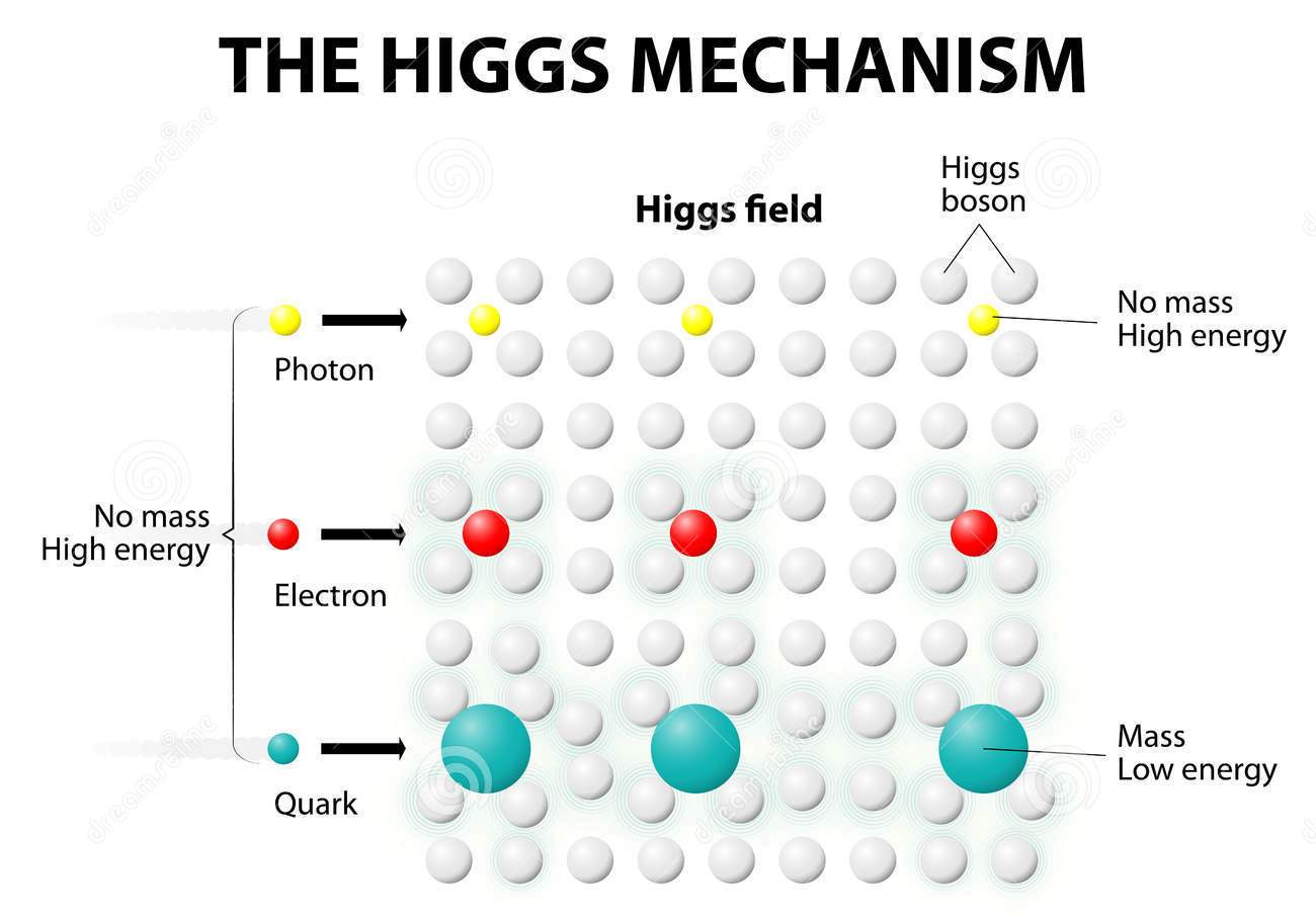 In elk geval bewerkstelligt het verschil in vrijheidsgraden dat een foton - en een gluon en het graviton - ongehinderd door het Higgs-veld bewegen, terwijl electrons en quarks (materiedeeltjes) en de andere krachtdeeltjes (bosonen) er wél mee reageren en massa krijgen. Het plaatje hierboven laat dat zien. Vóór intrede in het Higgs-veld heeft geen van de deeltjes massa, in het veld hebben ze dat wel, behalve het foton. Dat blijft onberoerd en massaloos (en het graviton ook?) Zelfs het geheimzinnige en nauwelijks waarneembare neutrino krijgt een hele kleine massa, maar of die van het Higgs-veld komt is niet zeker.