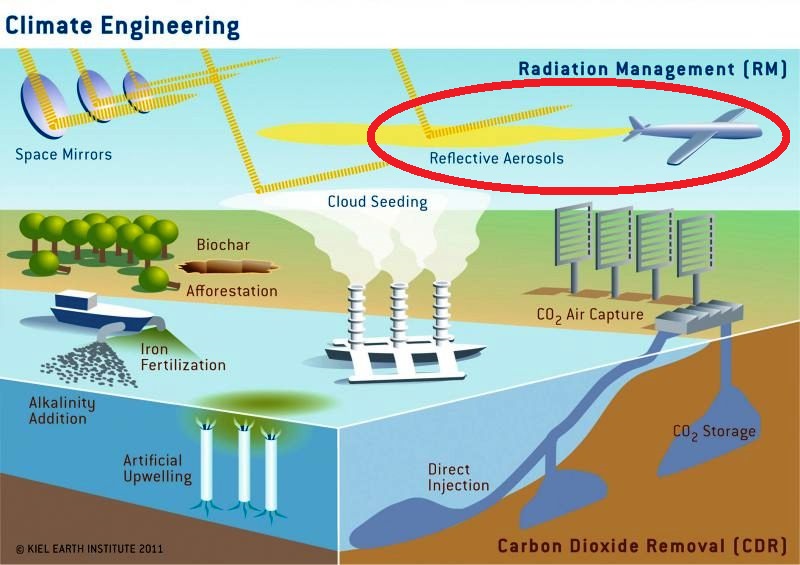 De methode is simpel. Je kunt zwaveldeeltjes (zwavelwaterstof of zwaveloxide) door vliegtuigen, balonnen of kanonnen laten uitstrooien in de lagere stratosfeer. Ook titaniumdioxide wordt genoemd. Het kan zelfs gebeuren door toevoegingen aan de brandstof van lijnvliegtuigen, die ze op kruishoogte (10 - 12 kilometer) automatisch uitstoten. Daaronder is de troposfeer, waarin het weer zich afspeelt. De kleine zwaveldeeltjes vormen met stof en water sulfaataërosolen. In de lagere stratosfeer bewegen de luchtmassa's zich horizontaal, zodat de reflecterende deeltjes lang aanwezig blijven, ongeveer een tot twee jaar.