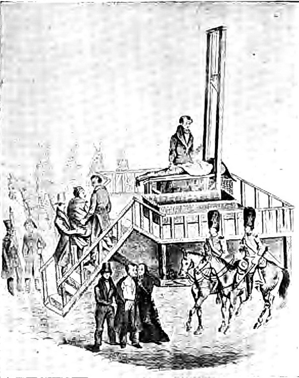 Terug naar de Boulevard du Temple. Volgens Wikipedia was het in 1838 een drukke weg. Koetsen, paard-en-wagens, ruiters. Paardenstront op straat. (Ik heb liever de lucht van paardenvijgen dan van uitlaatgassen, eerlijk gezegd) Er waren veel populaire theaters en café's. Sinds de tijd van Napoleon was Frankrijk weer een koninkrijk, al werd in 1835 juist in deze straat een mislukte aanslag gepleegd op de conservatieve Koning Louis-Philippe. De koning kreeg een schampschot maar 18 mensen vonden de dood, toen de Corsicaanse zadelmaker Giuseppe Marco Fieschi vanaf de derde verdieping van huisnummer 50 vier salvo's afvuurde op de koninklijke stoet met een primitief machinegeweer. Op 19 februari 1836 stierven Fieschi en zijn beide mededaders op de guillotine. Er werd geen foto van gemaakt, maar de schilder van de koning, Horace Vernet, kreeg de opdracht de terechtstelling op een tekening vast te leggen (zie hiernaast) |