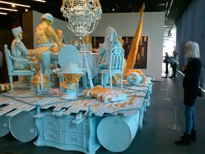 Daarna steken we de weg West - Oosterend over naar een project bij de Tigerbunker, onderdeel van het Bunkermuseum. Op een duin in het bos bij dat museum is het project 'Plan B' van Studio B / Moholy-Nagy University of Art and Design Budapest. 'Zal Terschelling zoals we het nu kennen, net als heel veel andere eilanden op de wereld, verdwijnen?', vragen de makers zich af. Voorwaar, ook een kritisch thema. Het project bestaat uiit een aantal met plastic omwikkelde ruimtes op pallets. In sommige ervan staan schemerlampen. Zie de foto hierboven. We vinden het matig. Er is trouwens ook geen Plan B voor de aarde.