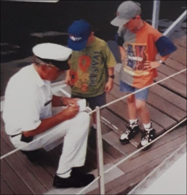 Havenmeester Remmelt Visser met Rommert en Bas op de steiger in Zierikzee.