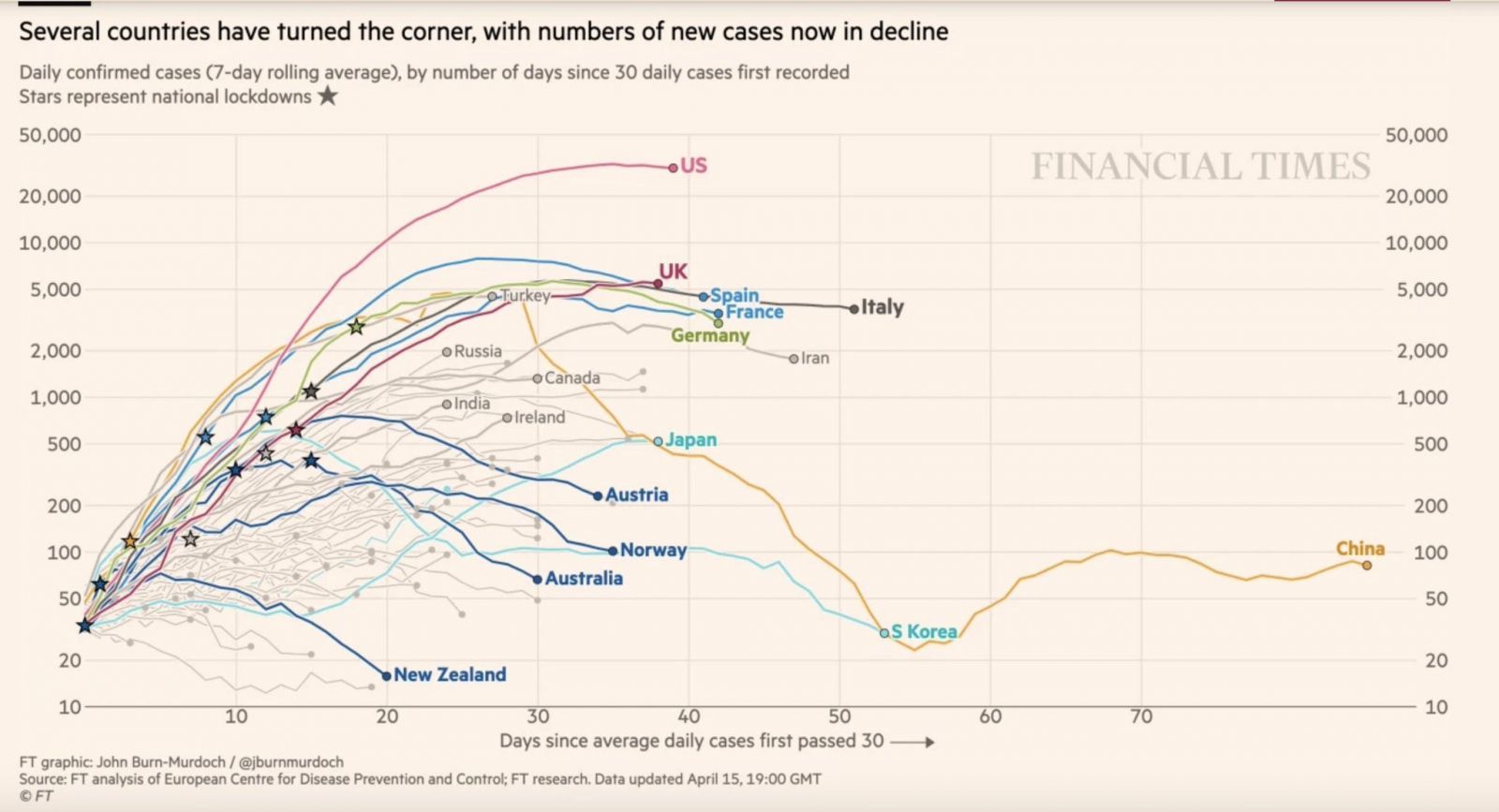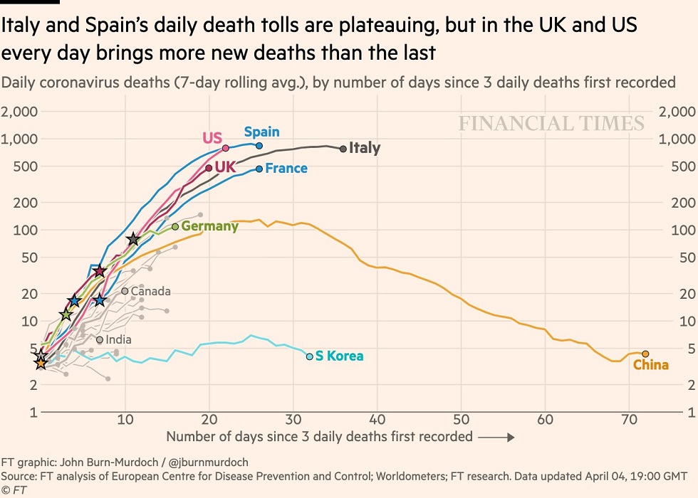 Maar let op! Een overzicht van het Europese Centre for Disease Prevention and Control van gisteren (gepubliceerd in de Financial Times) over de ontwikkeling van de wekelijkse sterfte, met als startpunt steeds toen er 3 doden/dag waren), laat zien dat in Ialië en Spanje de plateaufase is bereikt, terwijl in de VS en het UK de stijging verder doorzet. Juist de beide landen die het minst maatregelen troffen (hieronder).