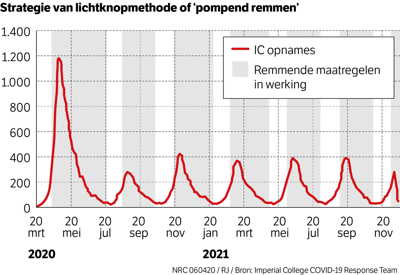 Deskundigen beweren echter steeds duidelijker dat het nog minstens een jaar zal moeten duren, zo niet langer. Het opheffen van maatregelen, bijvoorbeeld om de benarde economie wat lucht te geven, zullen naar alle waarschijnlijkheid een opleving van de epidemie veroorzaken, waarna het regime opnieuw strenger moet worden. Enzovoorts. Men noemt het 'de lichtknopmethode' en ook wel de strategie van 'pompend remmen' (hieronder):