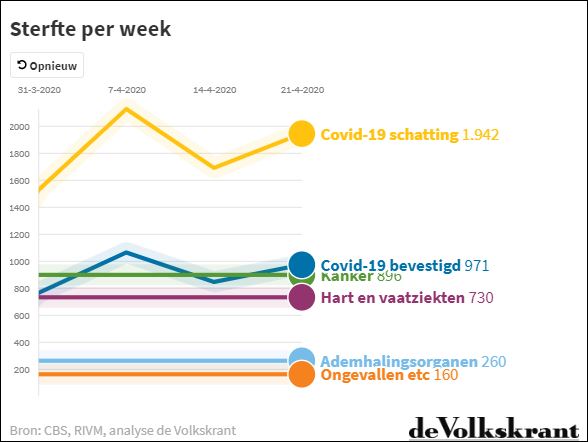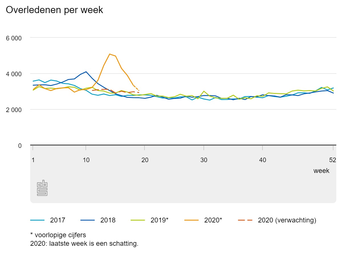 Wat al gedacht werd: de sterfte aan het coronavirus Covid-19 is ongeveer tweemaal zo hoog als het RIVM dagelijks doorgeeft, bericht De Volkskrant. Het is conclusie van het instituut zelf op basis van de jongste CBS-sterftecijfers tot en met de vierde week van maart (zie hierboven). Lang niet iedere overledene wordt getest, vooral ouderen in verpleeghuizen of ouderen die thuis sterven niet.