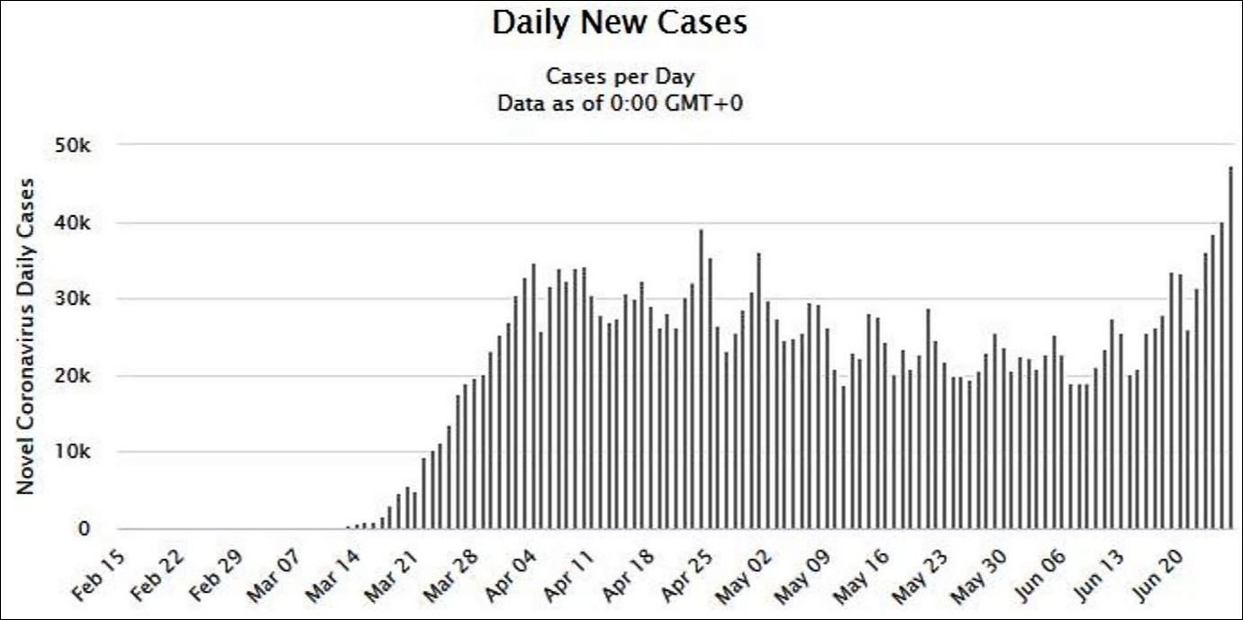 In de VS gaat het nu in hoog tempo mis met de corona-epidemie. Iedere dag worden records gebroken en is het aantal nieuwe besmettingen hoger dan de vorige dag. Vandaag zijn het er 45.300, die het totaal aantal besmettingen op 2,5 miljoen brengen. Je ziet het in de grafiek hierboven. Dit loopt uit op een maatschappelijke ramp van grote omvang.