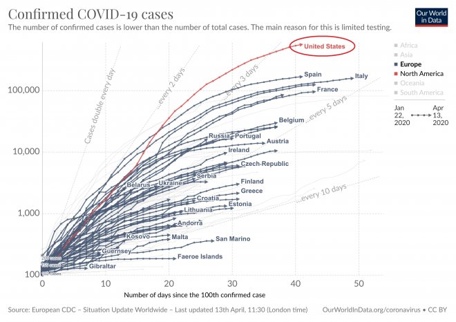 Voor het eerst werden er meer coronadoden in de VS geregistreerd dan in Azië. Maar Europa rijst er ver bovenuit (zie hierboven). Men ziet bij de WHO Europa als het epicentrum van de pandemie. Van de bijna 65 duizend doden wereldwijd vielen er ruim 45 duizend in Europa, met name in Italië en Spanje. Maar nu neemt het dodental in Noord-Amerika ook snel toe, terwijl het in Azië nog steeds lijkt te stabiliseren.