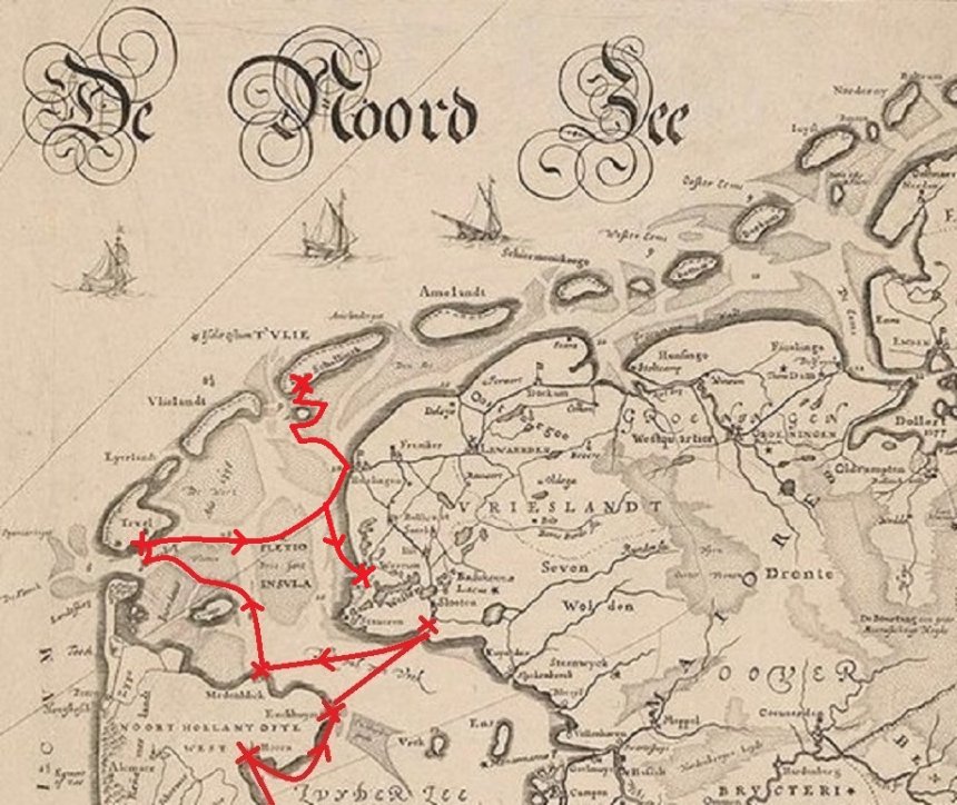 De afvaart is om kwart voor acht, bij een zonnige hemel en in plaats van de beloofde zuidwestenwind een wat vlagende wind uit NW. Omdat er aan beide kanten van de uitvaart van Medemblik velden met fonteinkruid zijn, vaar ik eerst een aantal mijlen naar noordoost. Geen zin om nog eens in dat spul te raken. Op een mijl of vier is een ondiepte, gemarkeerd door vier kardinale boeien. Ik vaar eromheen en neem een koers pal noord, naar de vaargeul voor Den Oever. Vlak in de wind. Aan bakboord ligt de Wieringermeer met een woud aan draaiende windgeneratoren. De meeste leveren aan de grote datacentra van internetgiganten zoals Google en Microsoft. Om half tien komen we bij de Stevinsluis, die warempel nog open staat mét groen licht. Hoe aardig, ze hebben op ons gewacht, want er liggen al wat jachten binnen. We varen zo binnen en na een kwartier varen we alweer uit, moeten nog even wachten voor de opening van de brug van de Afsluitdijk en om tien uur zijn we op zout water. De Waddenzee! Dat is even geleden. We zien in het westen hoge gebouwen, dat is Den Helder en meer naar het noorden Texel. We kiezen het Visjagersgaatje, dat noordwest loopt. Tevoren had ik met de stroomatlas bepaald dat we het tij mee zouden hebben, althans in de eerste helft van de oversteek. De beboeiing is goed zichtbaar. Een visser komt ons tegemoet (foto hierboven).