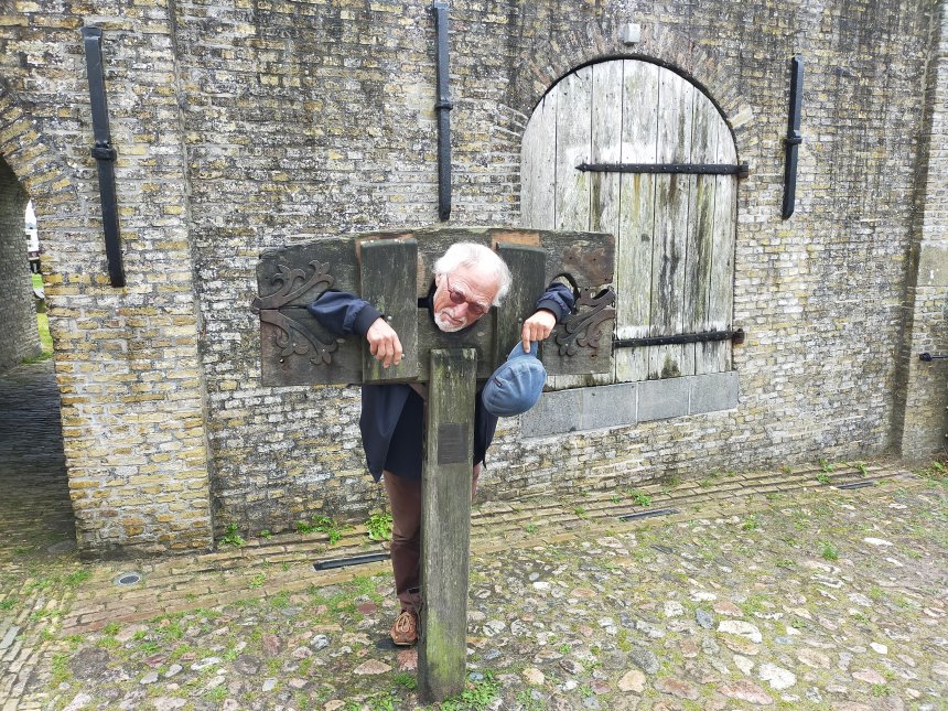 Zonneschijn lokt ons vanmorgen de wal op. Het is een mengeling van wolken en zon en belooft warm te worden. Soms trekt een grijze wolk over maar tot regen komt het niet. We boffen. We kuieren om de Pekelharinghaven heen, die vol ligt met jachten, langs een kinderboerderij met weinig empathische alpacas en geiten (foto hier) naar het Kasteel van Radboud (foto hier). Het is volledig windstil en de zeilen van de uitvarende jachten hangen slap. Het IJsselmeer is een spiegel met grote wolkenpartijen erboven. Het kasteel blijkt een klein museum te herbergen. Museumjaarkaarten! Het kasteel was overigens niet van de Friese koning, maar van graaf Floris V, der keerlen God, die het als dwangburcht tegen de West-Friezen zou hebben laten bouwen op de fundamenten van een burcht die wél van Radboud was. We krijgen gratis een boekje over kruiden uit 1476. 'Drink brandnetelthee het hele jaar door om gezond te blijven'. Hm, ik heb wel eens brandnetelsoep gegeten, die smaakte prima. Het kasteel is overigens maar een klein deel van de oorspronkelijke dwangburcht en is vaak verbouwd