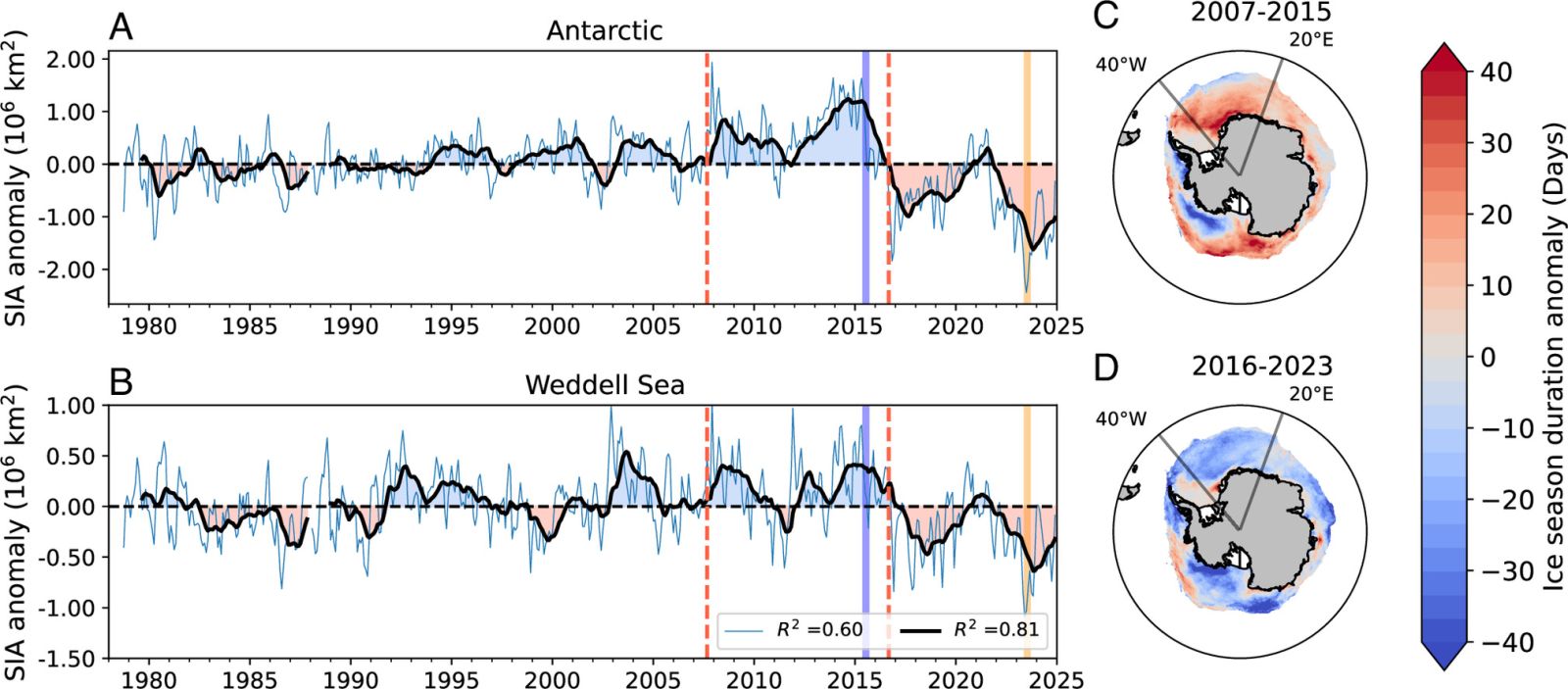 De omslag is ook duidelijk te zien in de Weddelzee ten oosten van het Antarctisch schiereiland. 'Within the Weddell Sea, the halocline (the boundary between saltier and fresher water) was relatively strong during the 2007–2015 sea ice expansion period, which suppressed vertical heat fluxes and contributed to the concurrent subsurface warming. The reduction in halocline strength after 2015 coincided with subsurface cooling, implying greater heat flux to the surface that would suppress sea ice growth'. In 2026 piekte de zeeijs-omvang op 15 maart - het was daar zomer - op 14.29 miljoen vierkante kilometer. In 2025 was het nog 14,33 miljoen vierkante kilometer. De neerwaartse tendens zet zich voort.